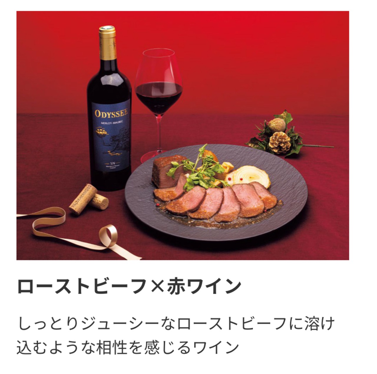 味わいはまろやかでふくよかな果実味から、タンニンが滑らかに溶け込み、バランスの良さが余韻まで持続します。上質なローストビーフの風味に溶けあいます