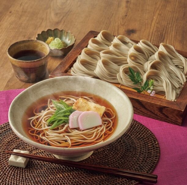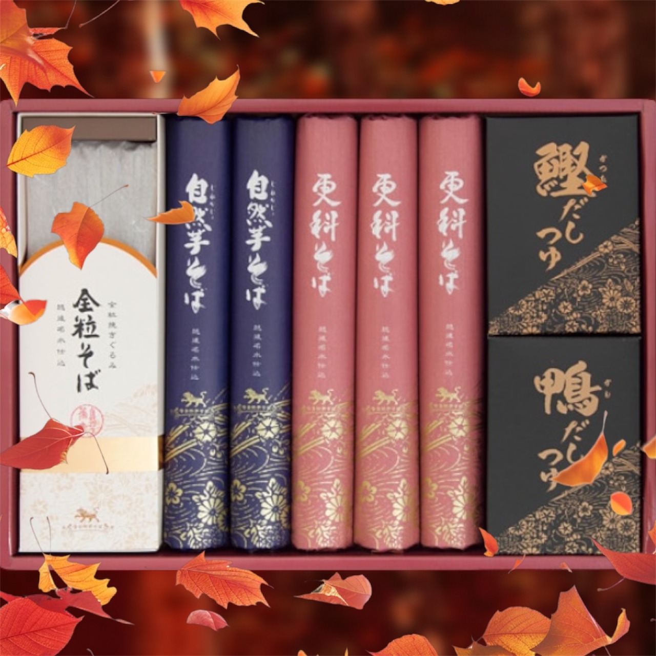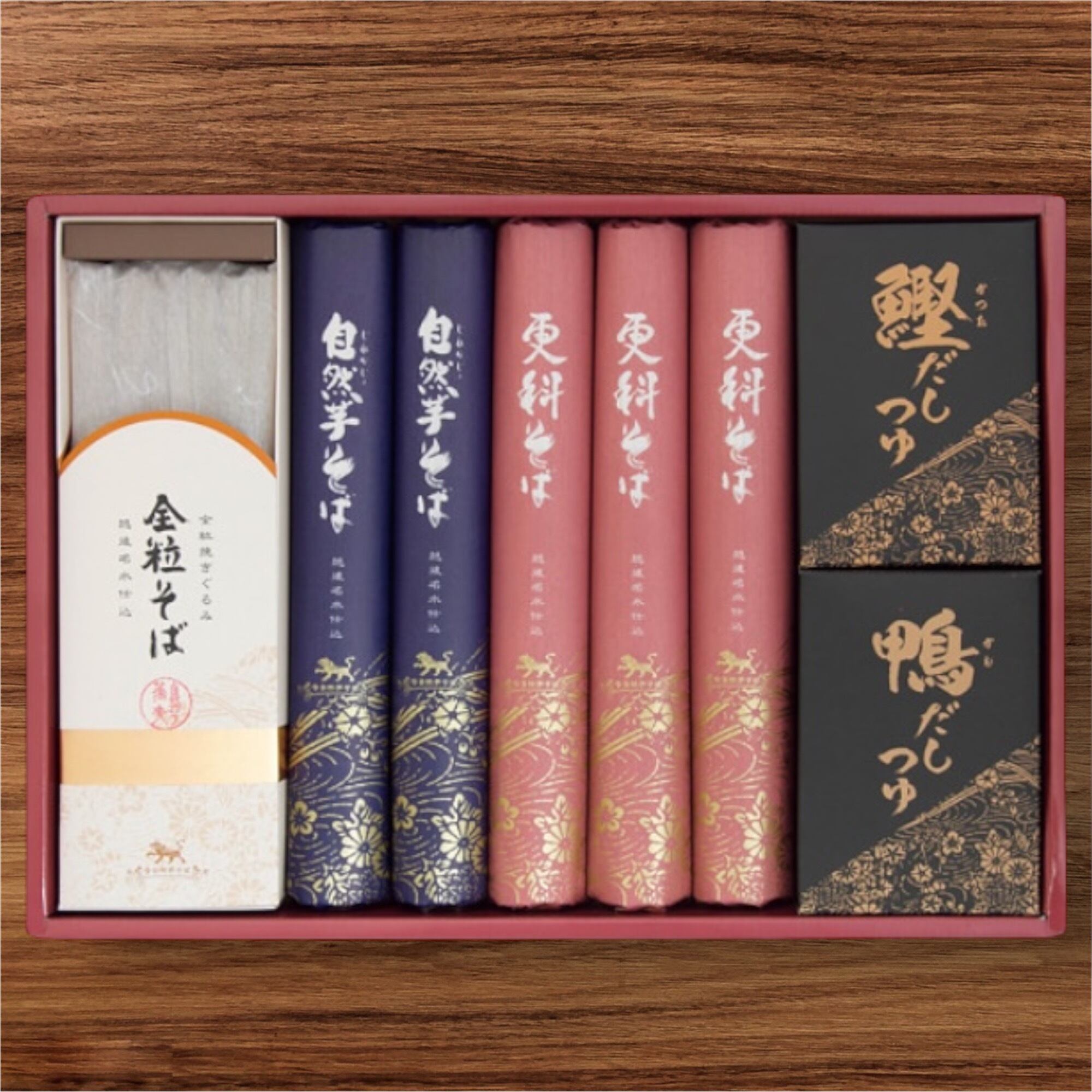 山芋と海藻が入った「自然芋そば」、歯切れが良い「更科そば」、更には蕎麦の実丸ごと入った「全粒そば」の食べ比べ。どれも新潟の名水製麺です。「鴨」と「鰹」の2種つゆ付き。ボリュームある詰合せです!